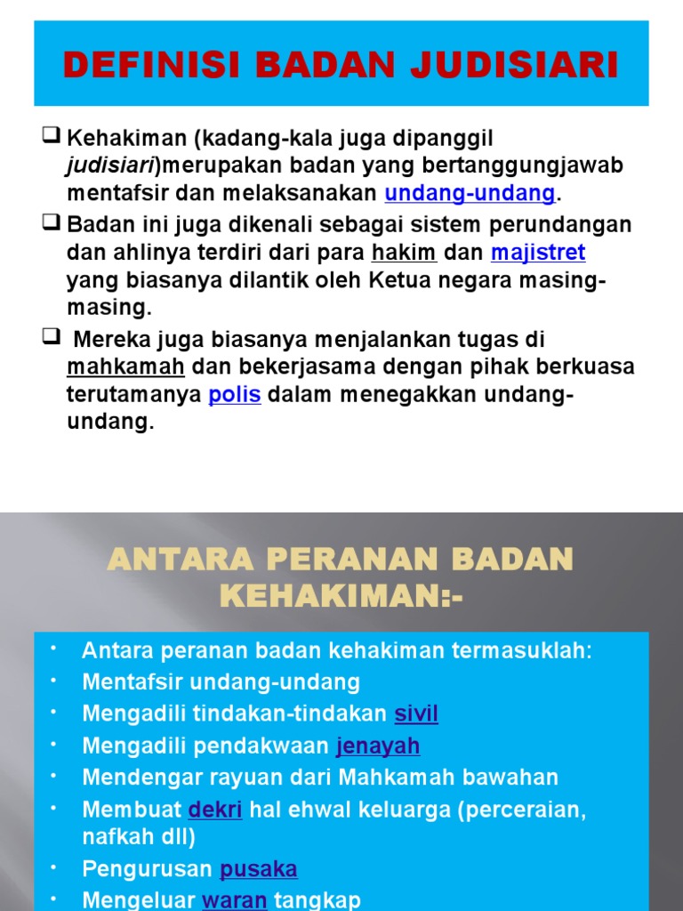 Badan kehakiman di malaysia by nur athirah. Badan kehakiman bidang kuasa mahkamah menentukan kesalahan undang undang. Boleh menyemak keputusan badan separa kehakiman kemalangan kenderaan bermotor pertikaian antara tuan rumah dan penyewa kesahan atau pembubaran perkahwinan perceraian dan perkara perkara berkaitan suami isteri. Badan kehakiman berkuasa dalam mentafsir dan menguatkuasakan perlembagaan. Badan kehakiman berkuasa dalam for more information and source, see on this link : For more information and source, see on this link : Badan kehakiman adalah badan ketiga dalam sistem kerajaan malaysia. Oleh yang demikian, sebagai salah satu badan kerajaan menurut doktrin pengasingan kuasa, badan perundangan memainkan peranan penting bagi meningkatkan kecekapan, ketelusan dan integriti kerajaan. Badan kehakiman berkuasa dalam apa. Badan kehakiman di malaysia by nur athirah. Menyelesaikan kekeliruan dan persoalan yang timbul. Badan kehakiman berkuasa dalam apa for more information and source, see on this link : Badan kehakiman berkuasa dalam apa.