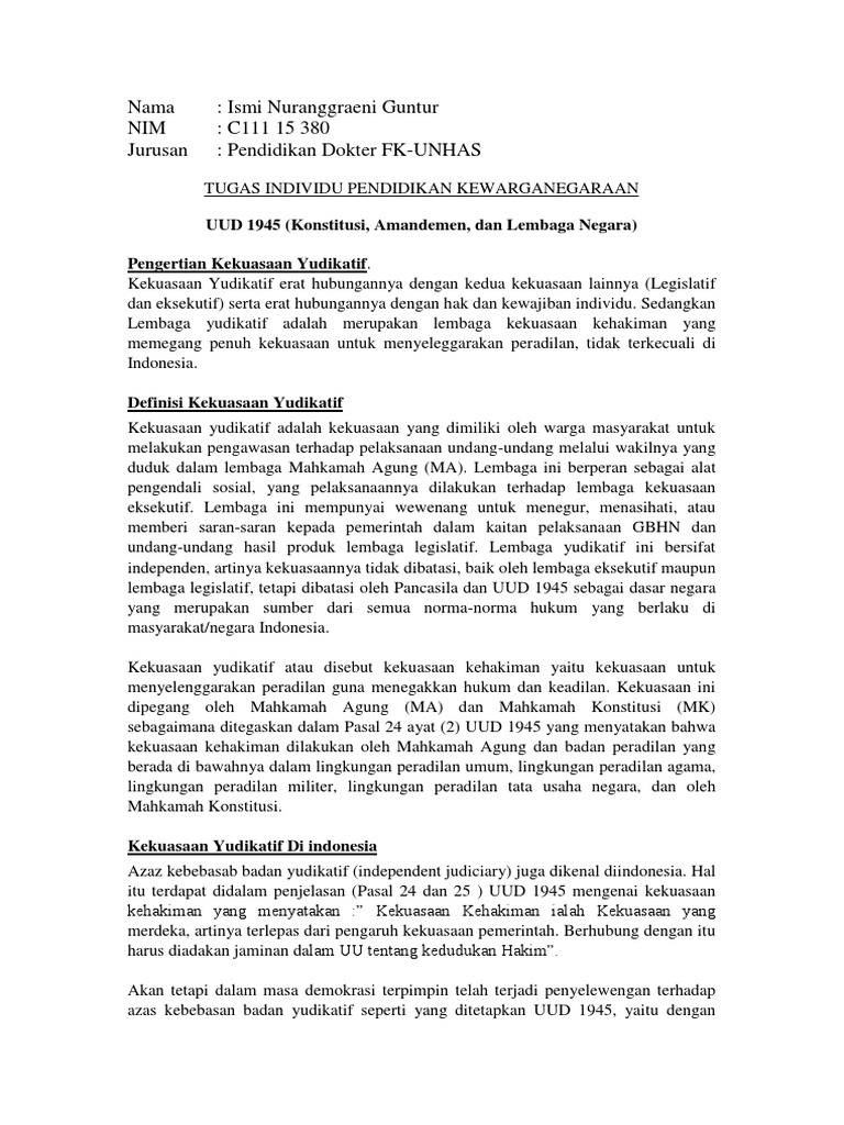 Mendengar kes rayuan petisyen pilihan raya. Badan kehakiman bidang kuasa mahkamah jenis jenis mahkamah. Mewujudkan badan peradilan indonesia yang agung pdf download gratis. Independensi kekuasaan kehakiman di indonesia pasca amandemen undang undang dasar 1945 fakultas syari ah dan hukum. Oleh yang demikian, sebagai salah satu badan kerajaan menurut doktrin pengasingan kuasa, badan perundangan memainkan peranan penting bagi meningkatkan kecekapan, ketelusan dan integriti kerajaan.