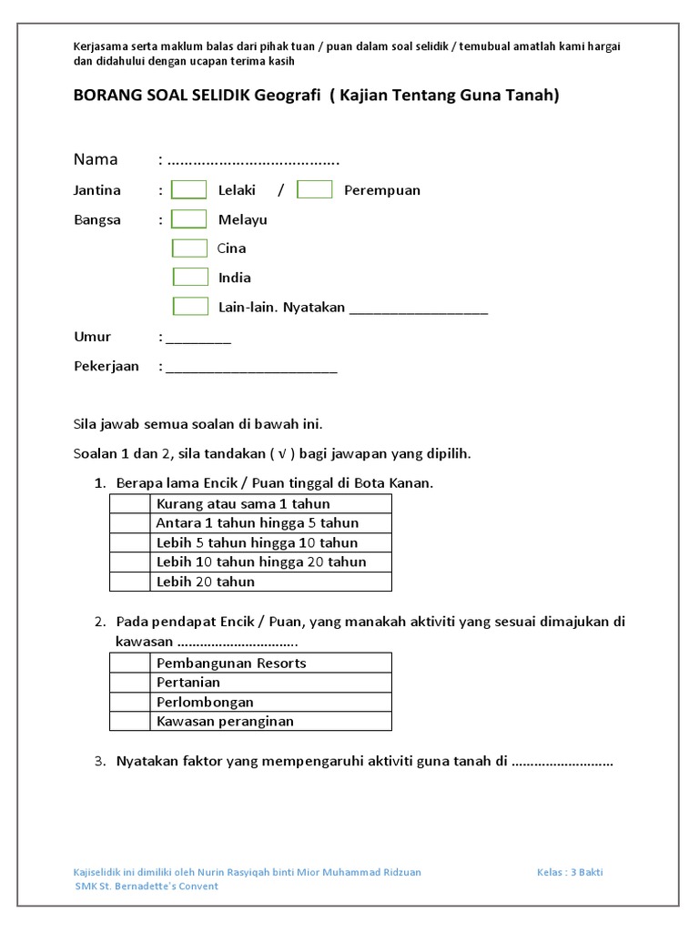 Related : Contoh Borang Soal Selidik Geografi Guna Tanah - Pastikan anda menukar nama kawasan kajian kegiatan ekonomi yang sedang anda jalankan bagi tugasan geografi pt3 2015 kali ini..