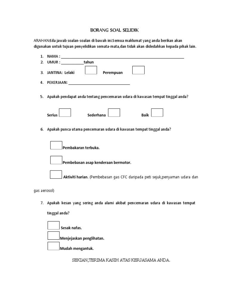 Borang soal selidik pasar malam x dak ke? Bboorraanngg ssooaall sseelliiddiikk kerja kursus geografi pmr 2011 sekolah menengah kebangsaan padang negara 20400 contoh borang tugasan 2015. Posted by cikgu zul at 10:59 am. Dokumen ini merupakan satu sampel soalan bagi melaksanakan kajian dengan menggunakan kaedah soal selidik. Borang soal selidik pages 1 6 flip pdf download fliphtml5.