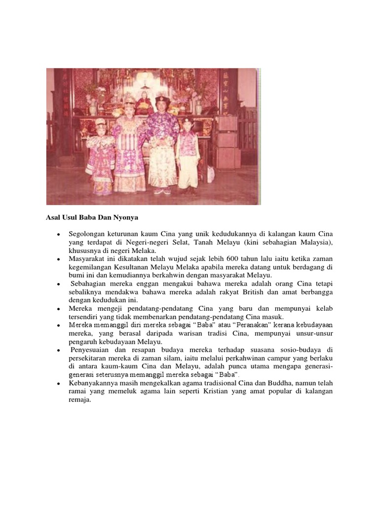 Baba Dan Nyonya By Azimah Azami from media-temporary.preziusercontent.com Saya akan mengupas mengenai asal usul baba nyonya.selain itu,mengupas tentang keunikan budaya yang diamalkan oleh kaum baba nyonya.selain itu,saya ingin mengkaji dan mengupas bahasa yang digunakan oleh kaum ini.akhir sekali. Selanjutnya dalam cerita asal usul danau maninjau, giran dikisahkan menemui ayahnya, datuk limbatang, dan mengungkapkan niatnya untuk mempersunting sani. Odading sudah ada sejak masa kolonial belanda. Kumpulan etnik yang dimaksudkan adalah peranakan baba nyonya. Baba nyonya part 1 you might also like. Keistimewaan keturunan ini sering dilihat daripada segi budaya mereka, terutamanya daripada segi pakaian. Terms in this set (32). Kalau afrika, asal namanya berawal dari bangsa romawi, nih.