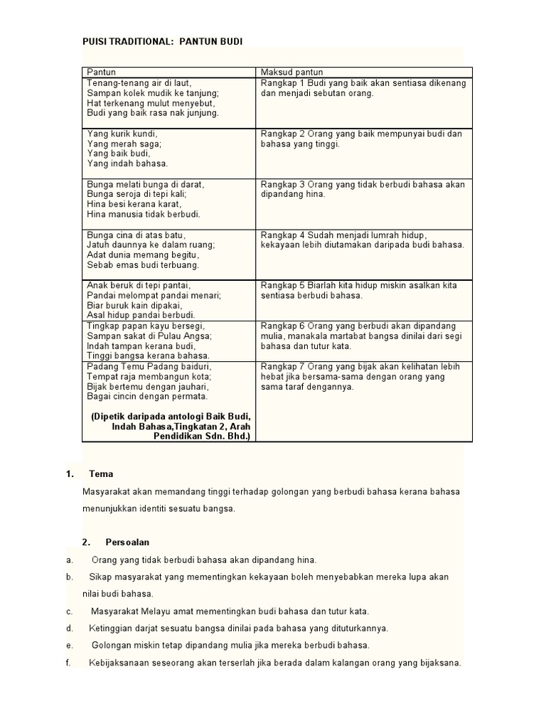 Pantun Nasihat T2 Worksheet from files.liveworksheets.com Pantun budi adalah pantun yang berisi tentang ajaran budi pekerti dan perilaku luhur dalam kehidupan bermasyarakat. Maksud, tema & persoalan, gaya bahasa, bentuk dan nilai pengajaran. Jika cermat, kamu akan mudah menemukan hubungan dari satu bait dengan bait selanjutnya. Antologi tingkatan 2 baik budi bahasa, indah bahasa pendeklamasi puisi tradisional direka cipta oleh myteach sdn. Daunnya lepas ke dalam ruang. Documents similar to latiahan pantun budi tingkatan 2. Pertama kasih kedua budi, yang mana satu nak didulukan? Semoga perkongsian ini dapat memberi manfaat kepada semua yang menontonnya.